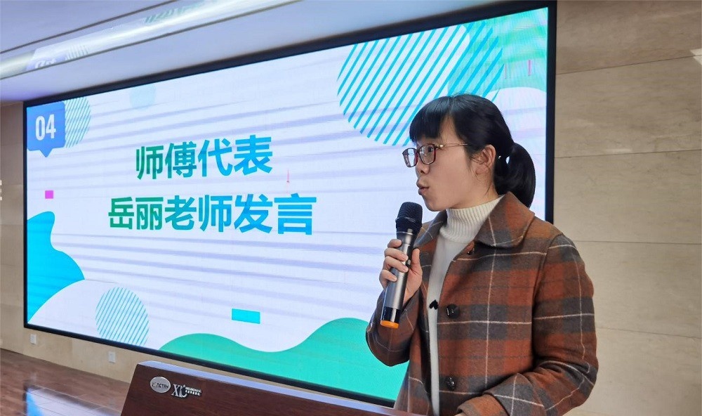 随后,信息教研组组长岳丽老师代表师傅发言,她表示,自己的成长路上也遇到了许多优秀的长者、导师,是他们循循善诱的指导帮助她快速成长。今天,她也荣幸地接过这神圣的接力棒,不遗余力地给新老师提供帮助和指导,促使他们不断提高业务水平,用最短的时间适应学校教育教学工作的需要。也期待在这个互学互助的过程中,自己得到不断提升。之后,徒弟代表蒋雨涛老师发言,他感谢学校搭建的成长平台,感谢领导和同事对年轻教师的关心与帮助,很荣幸能成为这个和谐、温暖、创新的大家庭一员。他表示,“学高为师,身正为范”,希望在师傅的带领下迅速成长一名合格的教师,为学校的创新发展贡献青春力量。