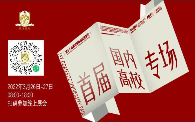 为应对国际教育领域新趋势,推动国内外高校升学“双出口”多元化发展,3月26-27日,由枫叶教育集团主办,第十七届枫叶国际教育博览会专场活动“首届国内高校专场展会”以线上展的形式启动,20多所国内知名高校和课外项目机构的代表将聚集云端,与学子及家长展开在线交流,助力枫叶学子拓展名校求学之路。